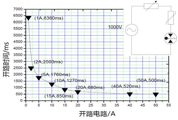 開路失效氣體放電管可以滿足這三點(diǎn)性能,且可以在工頻過來時很快切斷電路,如下圖為開路失效氣體放電管的工頻電流和斷開時間測試曲線: