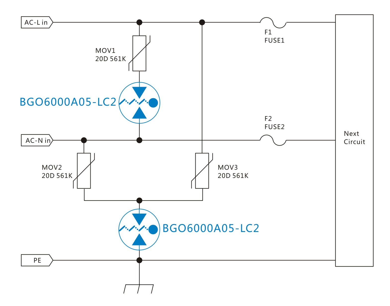 AC交流電源口通用三加一解決方案和T-MOV方案還是有導(dǎo)致起火燃燒的盲區(qū)存在,開路失效氣體放電管正好解決了這個盲區(qū),推薦使用在共?;虿钅Vg串聯(lián)壓敏電阻使用。